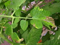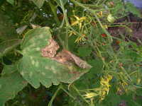 伝染方法:ほ場に残った発病葉・発病果上の病原菌や、地表面に菌核として残った病原菌が、伝染源となる。次期作では、そこから胞子が飛散して伝染する。