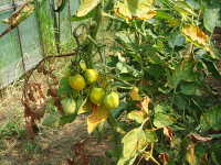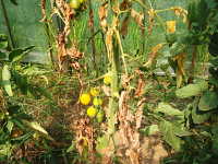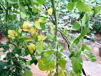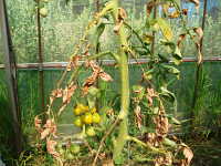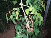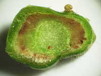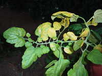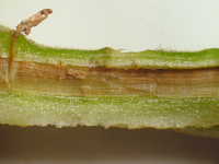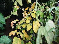 被害:導管部が侵され、葉が黄化して萎れ、次第に褐変枯死する。病勢の進み方は慢性的で、始めは茎の片側の葉だけが黄化することが多い。