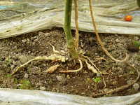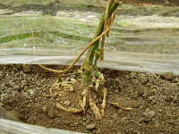 被害:根の組織がふくれてコブ状となり、株が生育不良となる。