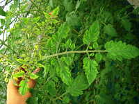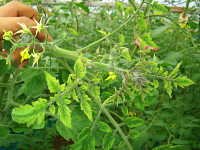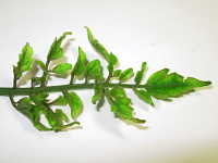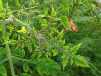| 発生時期:ミニトマトの生育期間中 病原:ウイルス(トマト黄化葉巻ウイルス:TYLCV) 伝染方法:タバココナジラミがウイルスを媒介する。(虫は死ぬまで伝搬する:永続伝搬) 被害:新しく展開する葉が縁から葉を巻き、葉脈間が黄化して縮葉する。上位葉が黄化縮葉し、節間が短縮して株全体が萎縮する。発病前に着果した果実は正常に発育するが、発病後は開花せず、開花しても結実しない。 |