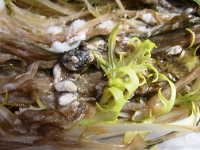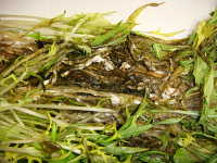 | 発生時期:周年 病原:糸状菌(かび) 伝染方法:地表面に落ちた菌核が伝染源となる。次期作では、そこから胞子が飛散して伝染する。 被害:葉に白色綿状のかびを生じ、後にネズミ糞状の菌核を生じる。 |