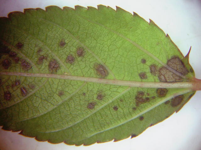 黒星病 褐色の葉脈で分けられた多角形病斑を生じる