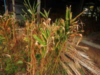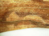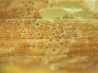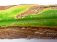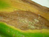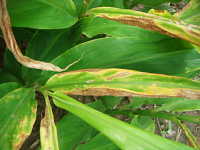 | 発生時期:6月〜9月 病原:糸状菌(かび) 伝染方法:土壌中に残った発病葉上の病原菌が伝染源となる。 被害:葉が周縁から枯れ、病斑部に黒色小粒点が見られる。 激発すると多数の葉が枯れる。 |