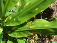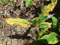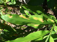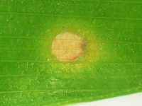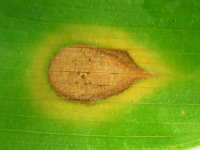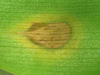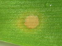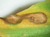 | 発生時期:6月〜7月 病原:糸状菌(かび) 伝染方法:被害残さ上の病原菌が伝染源となる。 被害:葉に褐色の紡錘形病斑を生じ、進展すると病斑が融合する。 |