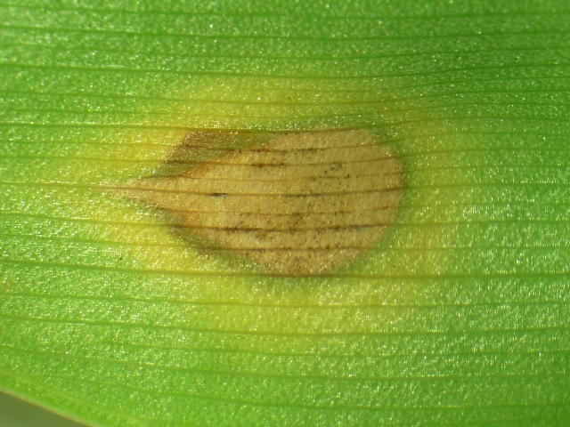 いもち病 紡錘形病斑(葉裏、胞子が見える)