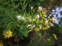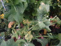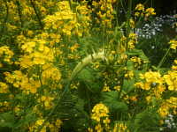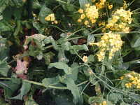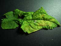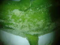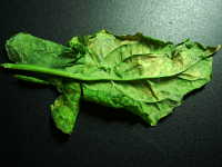 | 発病時期:3月〜4月 病原:糸状菌(かび) 伝染方法:発病茎葉上の病原菌が伝染源となる。 被害:下葉から輪郭不鮮明な淡黄色病斑を生じる。花茎は肥大して湾曲し、湾曲部に白いカビを生じる。 |
