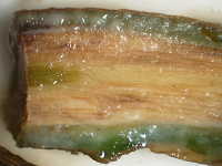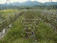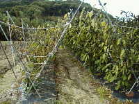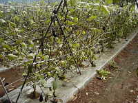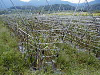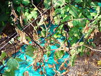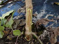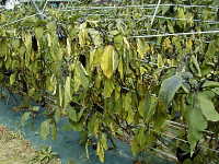 | 発生時期:7月〜10月 病原:細菌 伝染方法:土壌中に残った発病根内に病原細菌が長期間生存して伝染源となる。翌年に伸びた根の傷口から病原細菌が侵入して発病する。また、収穫時や剪定時の鋏の切り口からも伝染する。 被害:茎の導管が褐変し、地上部が数日で萎れ、回復しない。(青枯れ症状) |