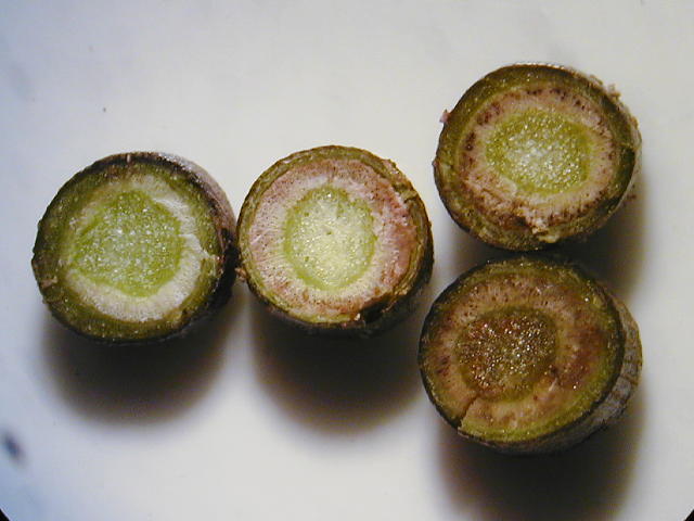 左から健全株、半身萎ちょう病株、青枯病株
