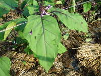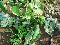 露地ナスは5月〜10月に栽培するため、降ひょうの被害を受けやすい。葉に穴が空くだけでなく枝折れも起こるが、ナスは回復力が高く、約1ヶ月で回復する。