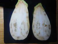 症状:果実がゆがみ、堅い。果肉内に褐変部分があり、堅くておいしくない。