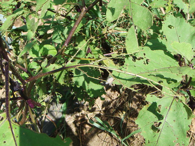 マメハンミョウ成虫により葉脈だけとなった葉