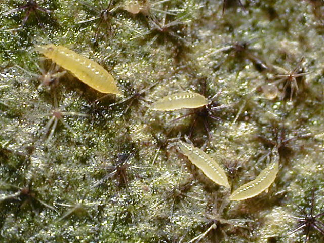ミナミキイロアザミウマ1齢幼虫(体長0.5mm)と2齢幼虫(体長0.8mm)