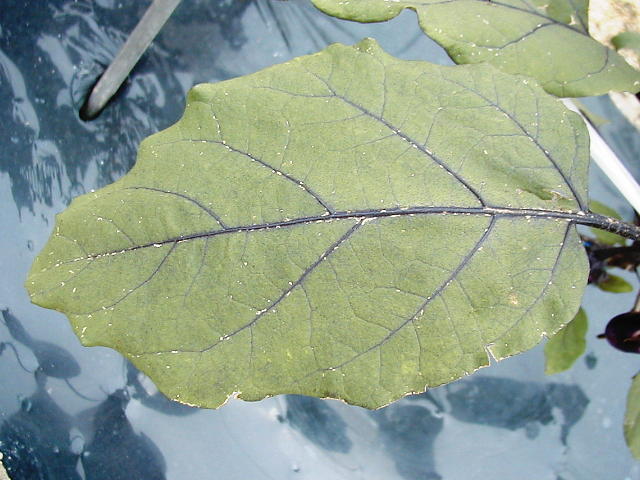 ミナミキイロアザミウマ 被害葉(葉表、葉脈に沿ったカスリ状斑点)