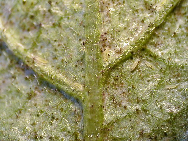 ミナミキイロアザミウマ 被害葉(葉裏、食害痕は光沢のある銀色になる)
