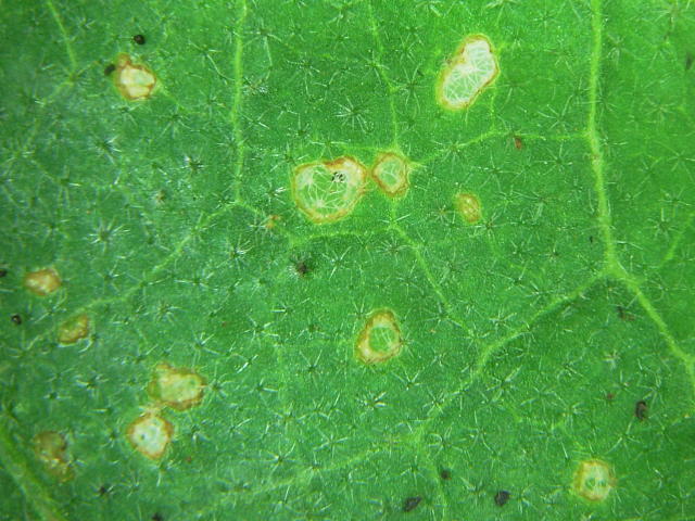 ナスナガスネトビハムシ 成虫食害痕(直径0.5〜1mm)