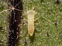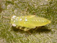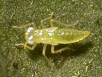 被害:成虫及び幼虫による吸汁害。(ただし、このヨコバイはチャやツバキの著名な害虫であるが、ナスではあまり被害が見られない。)