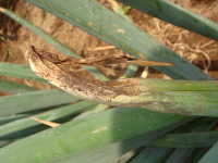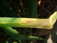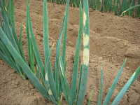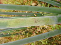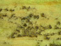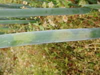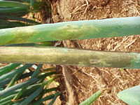| 発生時期:4月〜6月、9月〜11月 病原;糸状菌(かび) 伝染方法:病原菌は、葉についたまま越冬し、翌年春にそこから胞子が飛散して伝染する。 被害:葉の表面が灰色〜黒色のビロード状のかびで覆われ、紡錘形の大型病斑ができる。 |