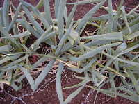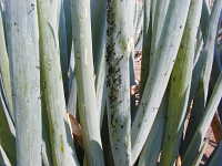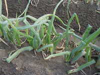 | 発生時期:4月〜6月、10月〜11月 病原:ウイルス 伝染方法:アブラムシ類がウイルスを媒介する。 被害:発病株は新葉の伸びが悪く、下葉は垂れ下がって葉先から枯れ込む。発病葉はモザイク斑紋や条斑を生じ、よじれる。 |