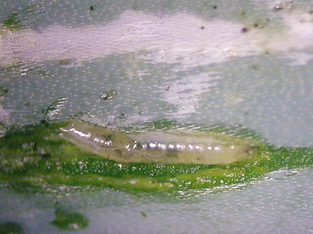 ネギハモグリバエ幼虫(体長3mm)
