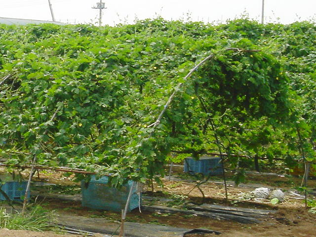 パイプハウスの骨組みを使ったニガウリ栽培