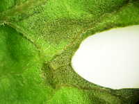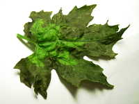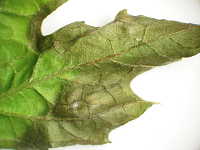 | 発生時期:6月 病原:糸状菌(かび) 伝染方法:ほ場に残った発病葉上の病原菌が伝染源となる。 被害:葉に大型の暗緑色病斑を生じ、病斑上に黒色小粒点を多数形成する。 |