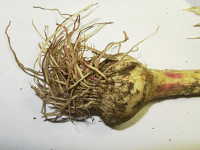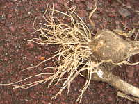 | 発生時期:5月〜6月 病原:糸状菌(かび) 伝染方法:病原菌は根の残さとともに土中に残り、土壌伝染する。 被害:根が次第に紅色に変色し、株が生育不良となる。 |