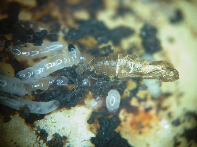 クロバネキノコバエ類 蛹殻(体長3mm)と幼虫