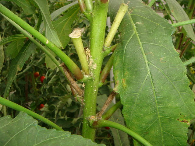 アズキノメイガ 幼虫が葉柄基部を食害