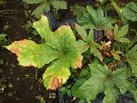 被害:葉に周縁部は濃褐色で内部は淡褐色の不整形病斑を生じる。