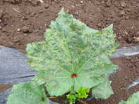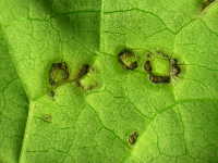被害:葉に円形ないし不整形の病斑を生じる。参考:葉裏病斑は色が淡い。