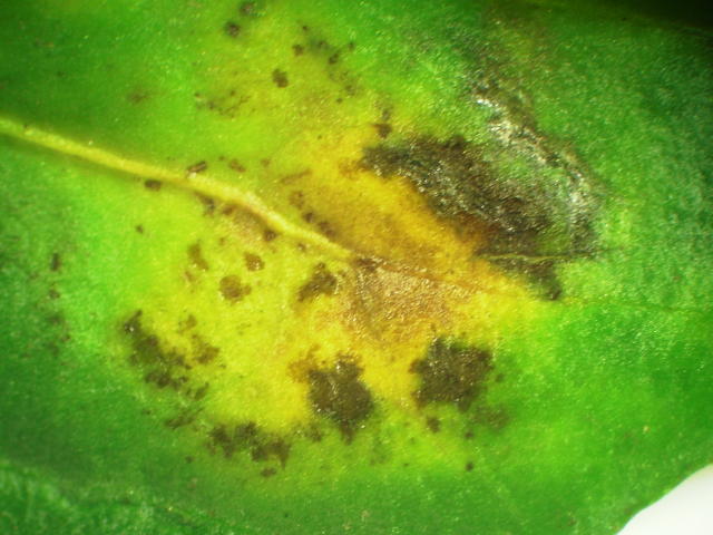 アルタナリア属菌による葉枯れ 黄色いハローのある病斑