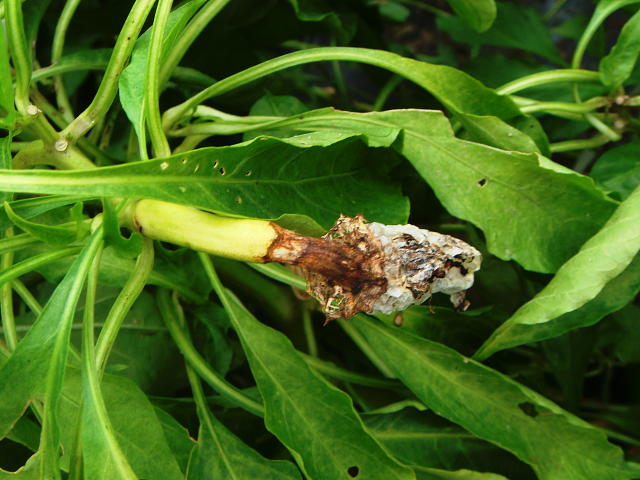 菌核病 茎に白いカビとネズミ糞状の菌核を生じる