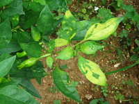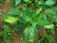 被害:葉にモザイク症状を生じ、果実は奇形となり、株全体が生育不良となる。