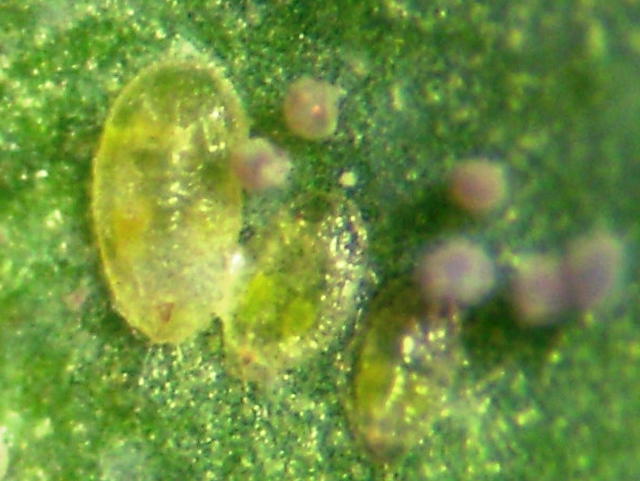 タバココナジラミ1齢幼虫(体長0.3mm)及び3齢幼虫(体長0.5mm)