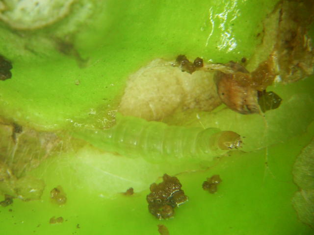 チャノコカクモンハマキ老齢幼虫がへた部を食害
