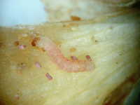 被害:幼虫によるりん茎の食害。