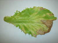 | 発生時期:12月 病原:糸状菌(かび) 伝染方法:ほ場に残った発病葉上の病原菌が伝染源となる。次期作では、そこから胞子を飛散して伝染する。 被害:葉に葉脈で囲まれた黄緑色病斑を生じる。 |