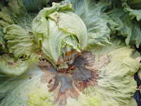 | 発生時期:11月〜4月 病原:糸状菌(かび) 伝染方法:ほ場に落ちた発病葉上の病原菌や、地表面に菌核として残った病原菌が、伝染源となる。次期作では、そこから胞子が飛散して伝染する。 被害:地際の茎や下葉基部に灰色かびを密生した病斑を生じる。その後、病気は結球部にも進展する。 |