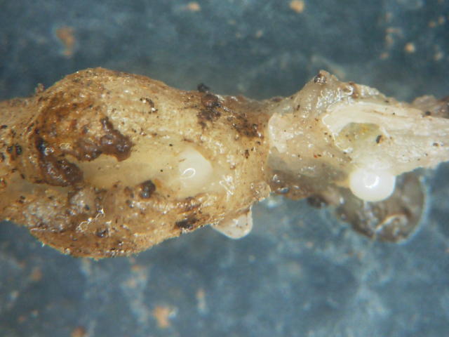 ネコブを開いたらネコブセンチュウ雌成虫(直径0.6mm)が出てきた