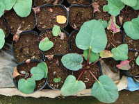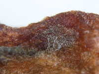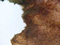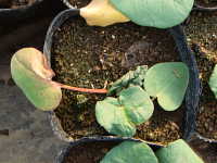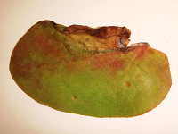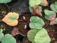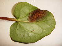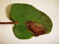 被害:葉に茶褐色の大型楕円形病斑を生じ、発病葉が次第に枯れる。