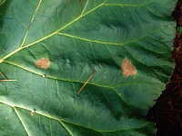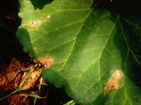 | 発生時期:8月 原因:普通化成肥料8-8-8散布時に、誤って肥料が葉に直接乗った。 被害:肥料が乗った部位の葉が白褐色に変色し、その後穴あきになる。 対策:肥料を丁寧に散布する。 |
