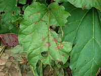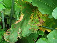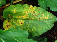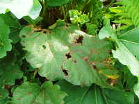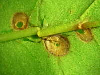 被害:葉に褐色楕円形病斑を生じ、病斑は穴が空きやすい