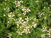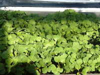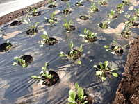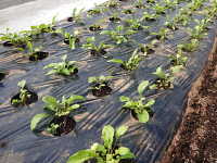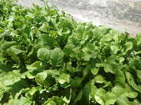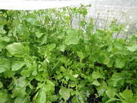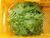 ルッコラは4月上旬に播種し、5月中旬〜下旬に収穫する。葉はゴマの風味がする。