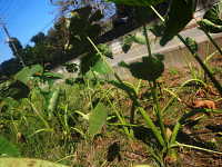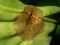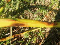 被害:葉に同心輪紋病斑を生じ、次第に拡大する。葉柄にも黒いしみ状病斑を生じ、発病葉は垂れ下がる。