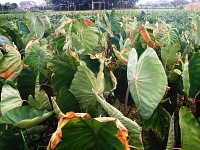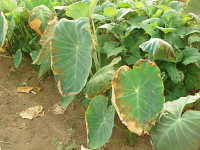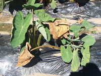 サトイモは、夏期に高温少雨が続くと干害を受け、葉が枯れ、草丈が低くなり、いもが減収する。
