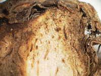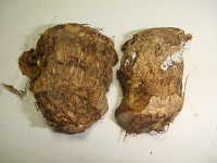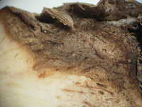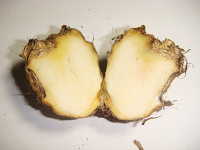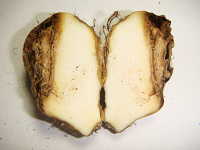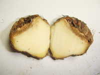 | 発生時期:10月 病原:糸状菌(かび) 伝染方法:種イモ伝染及び土壌伝染する。 被害:イモの内部が褐変し、スポンジ状となる。腐敗臭はない。 |