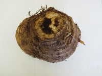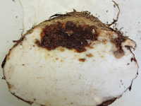 被害:イモの収穫後の切り口に成虫が産卵し、幼虫がイモを食害して褐変させる。