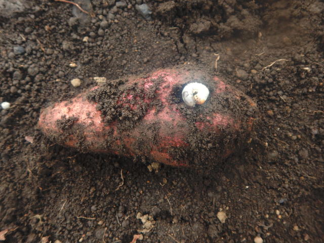ドウガネブイブイ イモの表面で幼虫が丸まっていた