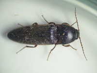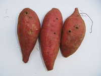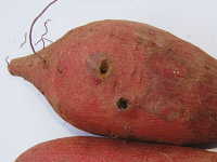 | 発生時期:9月〜10月 被害:マルクビクシコメツキやクロクシコメツキの幼虫であるハリガネムシが、イモに直角に円形の小さな穴をあけて食害する。 |