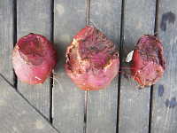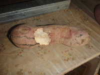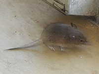 | ハツカネズミは雑食性で、種子や穀物類、小型の昆虫類などを食する。 これは、2月にサツマイモが入った発泡スチロールの箱(ゴザで蓋をしてある)の底から穴を空けて入り、食害した事例である。 平成29年は、サツマイモの収穫時にハツカネズミによる食害が数カ所で見られた。 |